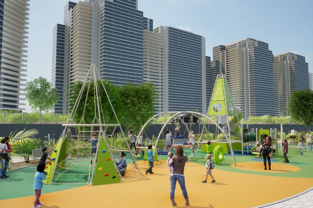 The playground’s visual language draws inspiration from the island’s organic shape and waterfront views.