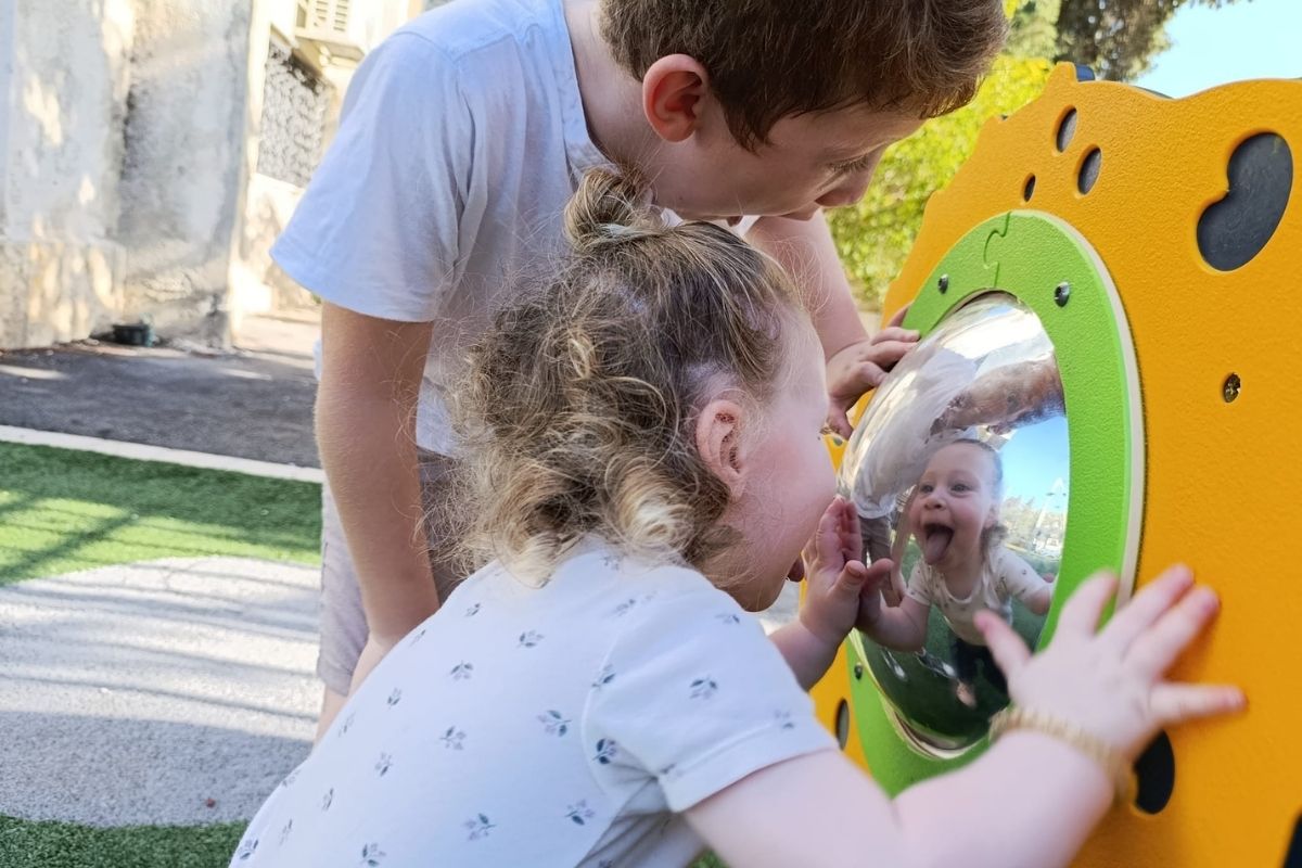 The main structure is designed like a story you discover while moving: step up a level, peek through a semi transparent printed panel, cross to the next section, and find a new point of play. The printed panels add depth and atmosphere without closing the structure off, and they help maintain clear sightlines for accompanying adults while keeping the experience visually rich.