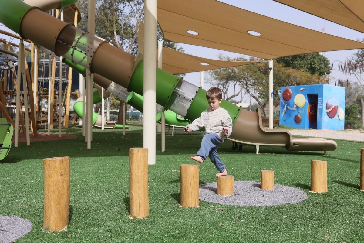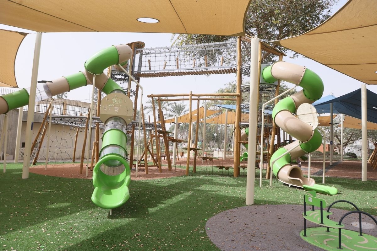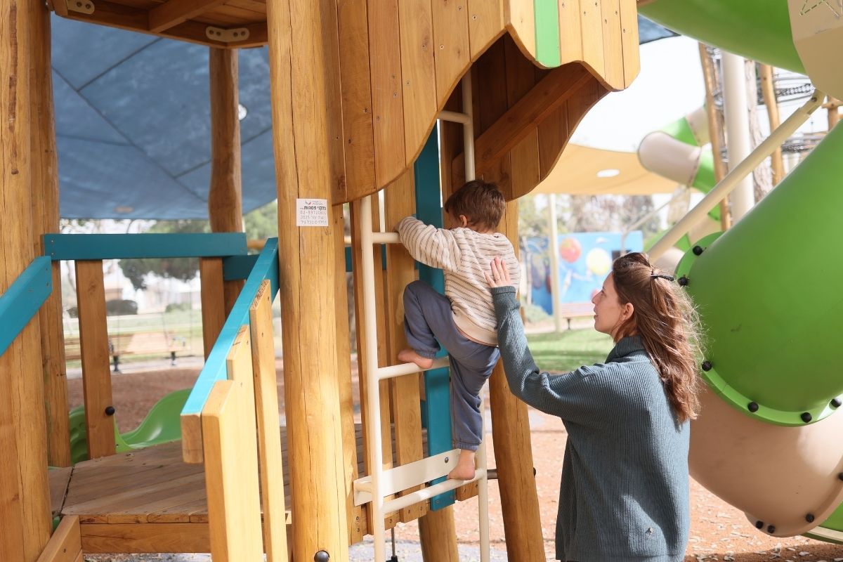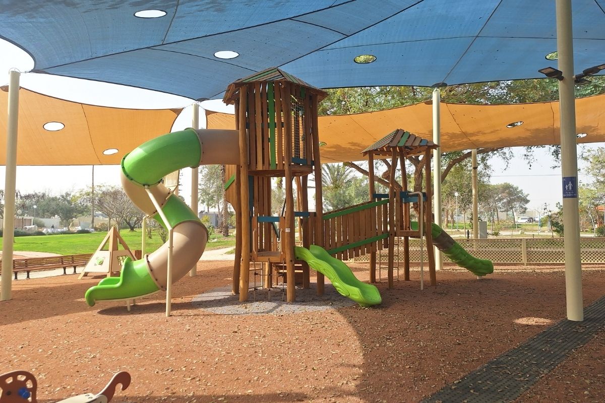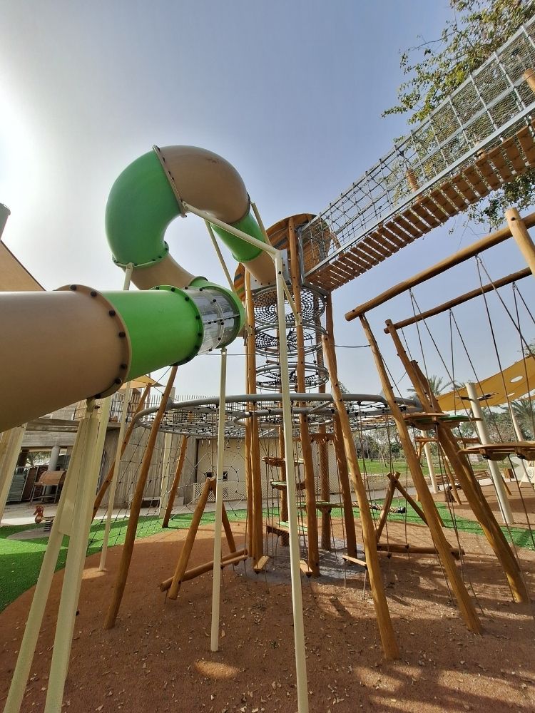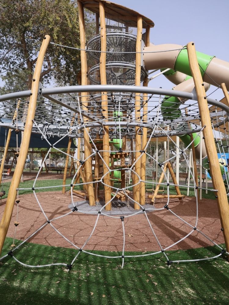 Psagot Playgrounds led the planning of a robinia wood playground centered around an iconic flagship structure. The multi-level play system includes tall towers, enclosed high slides, rope bridges, perimeter climbing nets, and elevated circulation paths.