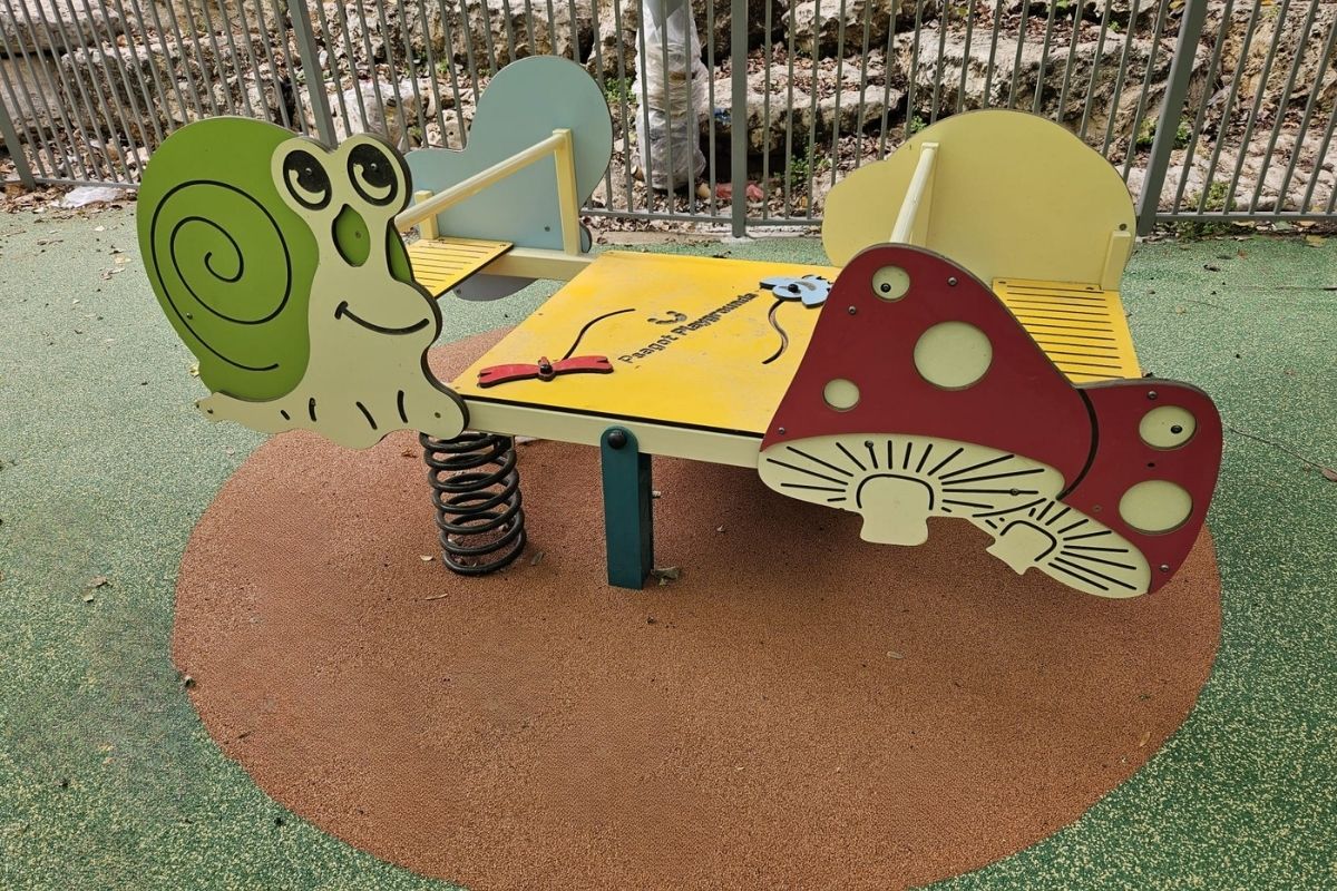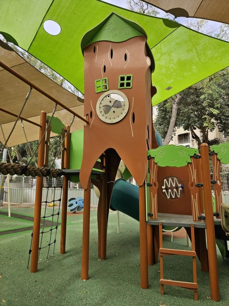 At the center of the playground is a combined play unit inspired by a treehouse, with illustrated details and playful character, alongside an igloo-shaped climbing element, a spring rider for four children, and a small playhouse for imaginative play. The shade planning was also integrated into the overall design, with soft and lively colors that work naturally with the equipment and help create a magical woodland-inspired atmosphere.